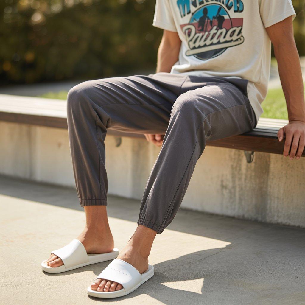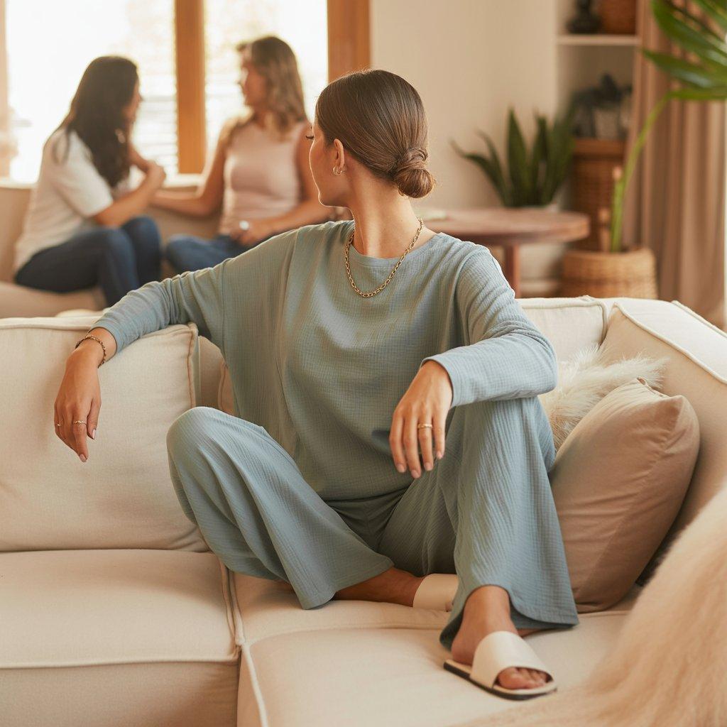 Slides or simple house shoes finish the outfit while keeping it relaxed. Add a light necklace or tidy hairstyle to elevate it just enough.