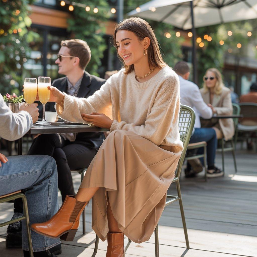 For a slightly dressier daytime look like brunch or a casual gathering a knit sweater with a midi skirt and ankle boots is a great combo. Choose a sweater that’s soft and not too heavy. Neutral colors like cream, tan, or soft pastels work with almost any skirt. A midi skirt (one that falls between knee and ankle) adds flow and movement to the outfit.