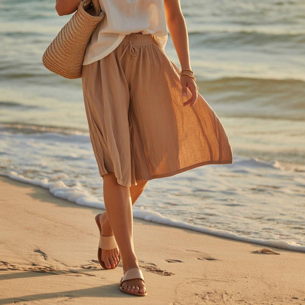 For a day by the water or a warm afternoon walk, linen shorts with a simple tank top are perfect. Linen feels breezy and cool, which is great on hot days. Choose shorts in light tones like tan, white, or soft blue. Pair with a basic tank top that fits comfortably, and add flat sandals that you can walk in easily.