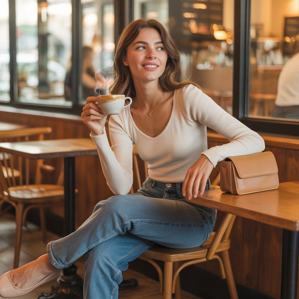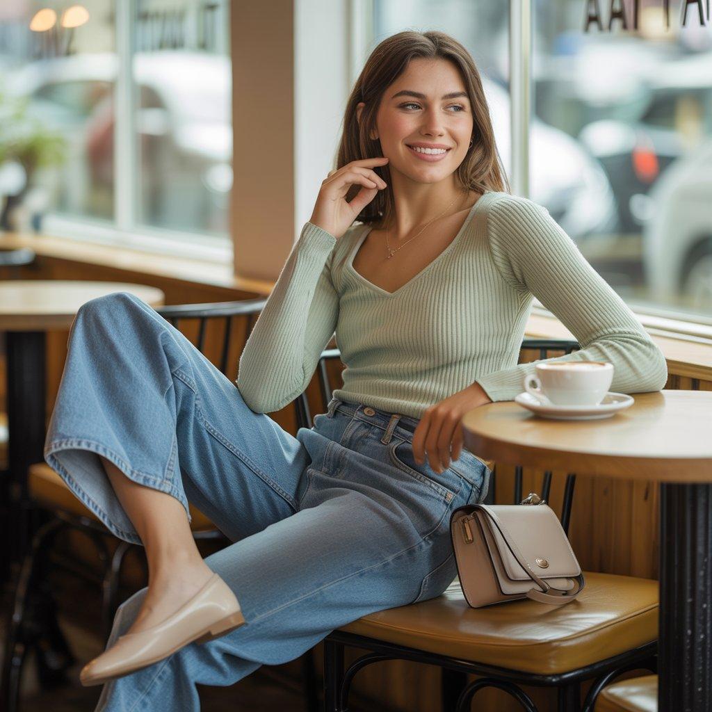 For a casual coffee date or meet-up, this outfit feels soft, approachable, and natural. A ribbed top fits close without feeling tight, which keeps the look clean and comfortable. High-waist jeans balance the outfit and give a flattering shape without trying too hard.