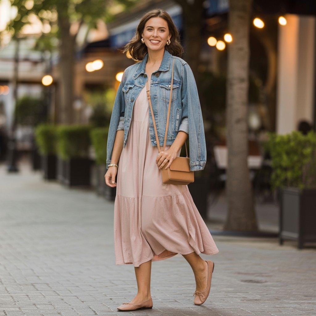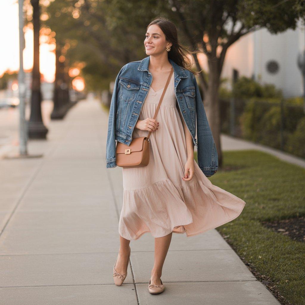 11. Date Night Casual: Flowy Dress + Denim Jacket + Flats