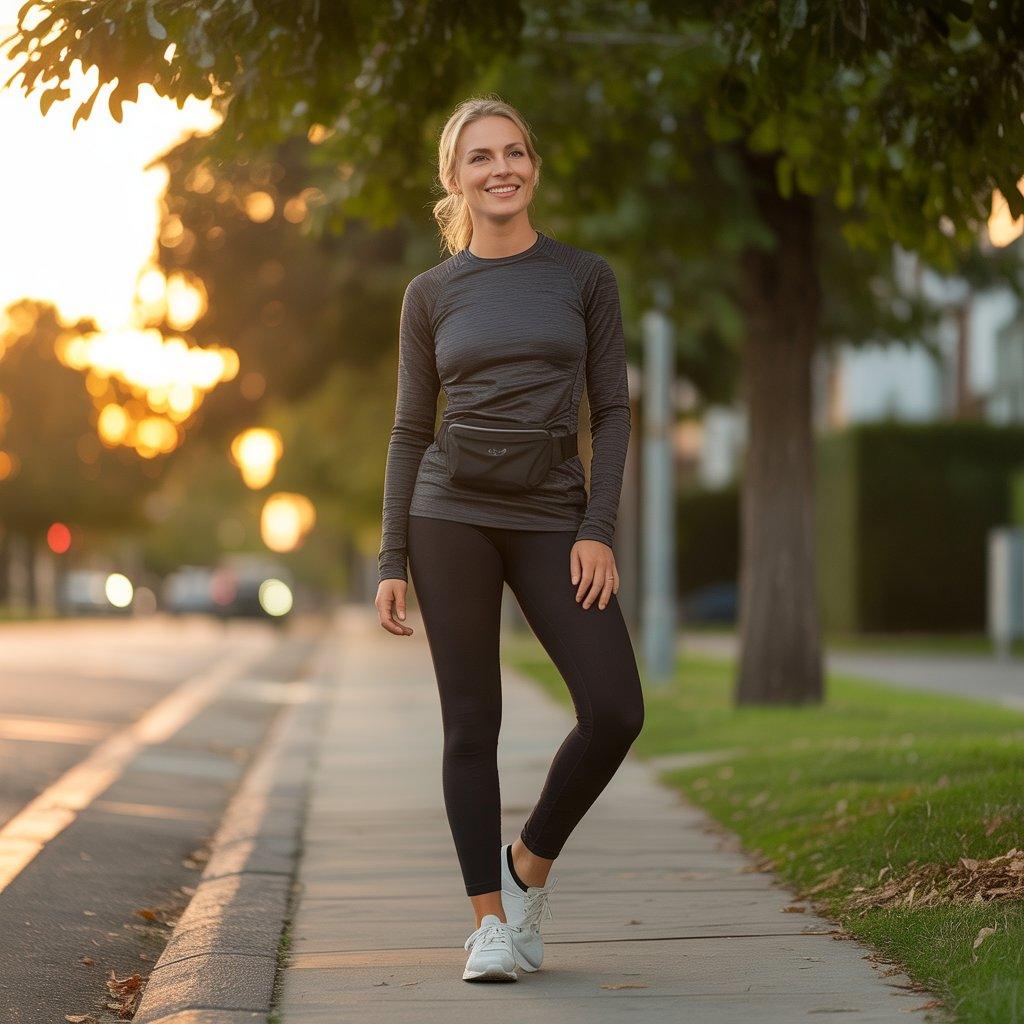 For evening walks or light activity, this outfit is simple and functional. A long-sleeve top provides warmth without feeling heavy, and leggings allow easy movement. Trainers keep your feet supported and comfortable.