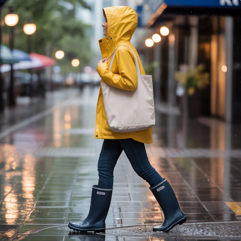 On rainy days, comfort and practicality matter. A waterproof jacket over your favorite jeans keeps you dry, and rain boots mean you won’t slip or get soggy feet. Choose a bright color for your jacket if you want a little extra vibe on a gloomy day.