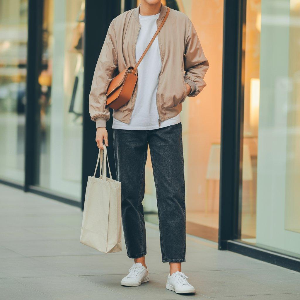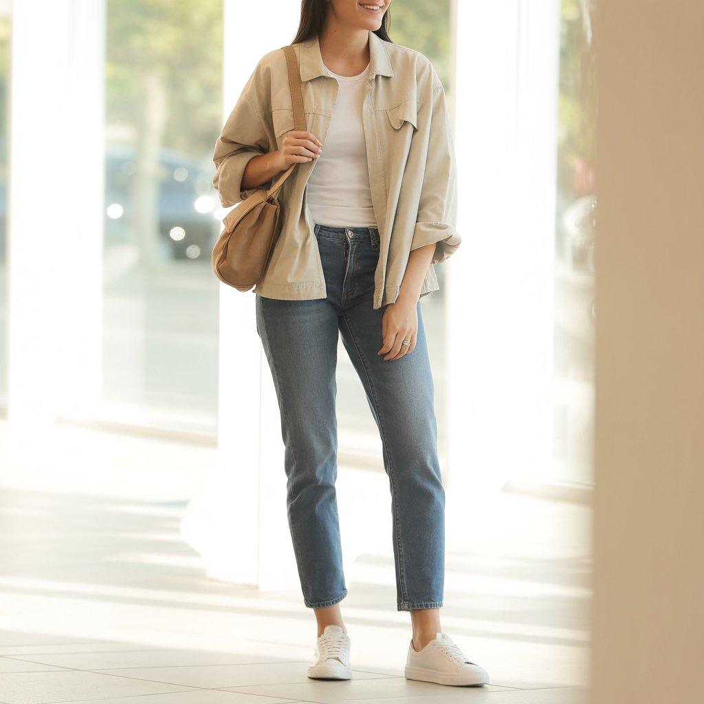 For a full day of shopping or errands, layers are your best friend. A lightweight jacket over a basic tee gives flexibility if the weather changes. Straight-leg jeans keep the outfit balanced and comfortable for walking.