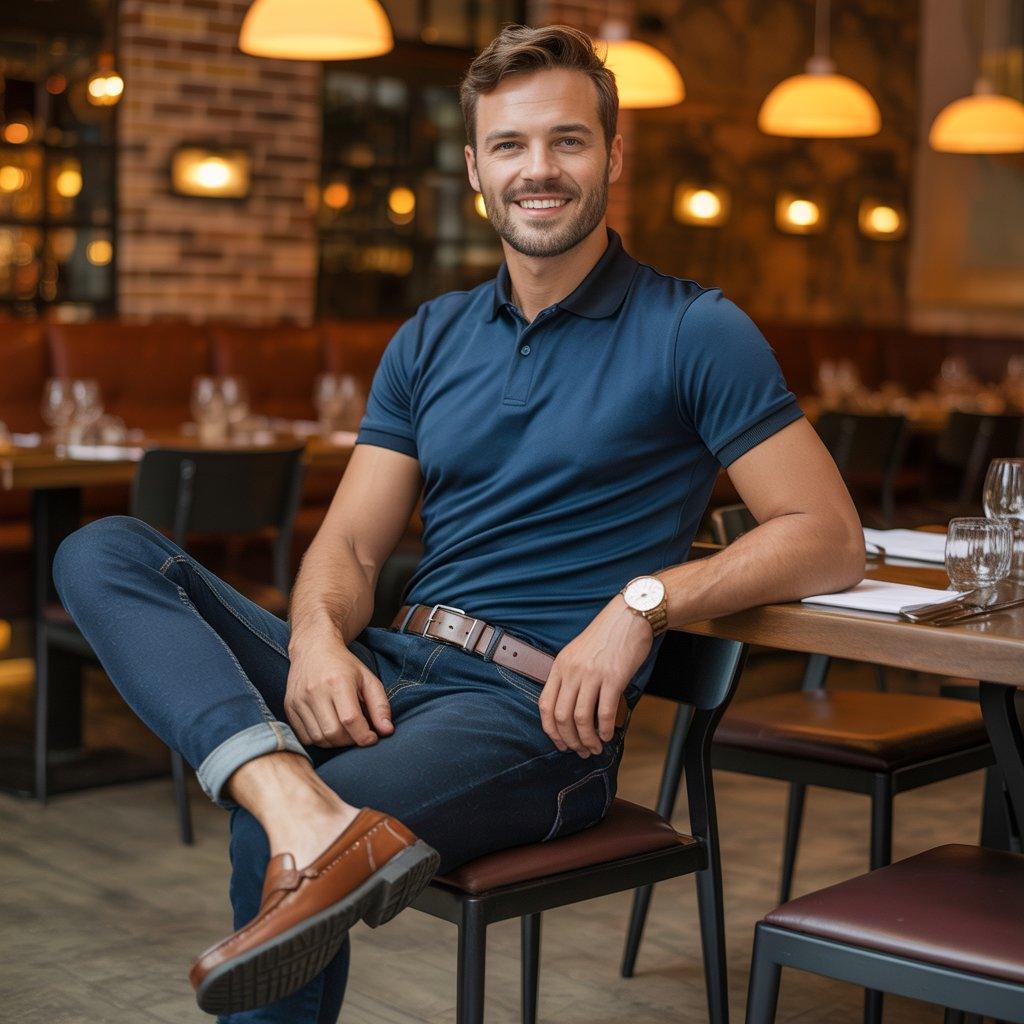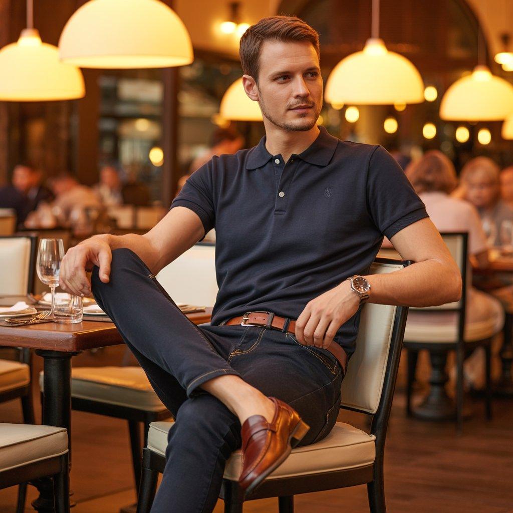 When dinner plans are a bit more than casual but not fully dressy, a polo shirt with dark jeans and loafers is a reliable choice. A polo shirt feels more refined than a T-shirt but still stays relaxed. Dark jeans make the outfit look neat and intentional without feeling formal.