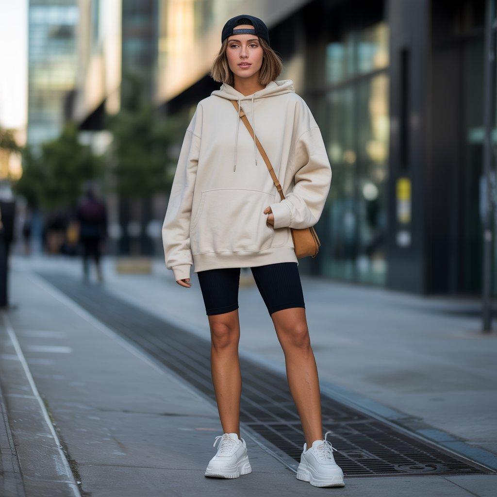 Street style doesn’t have to be complicated. An oversized hoodie with biker shorts and chunky sneakers is currently a look that’s both comfortable and eye-catching. The hoodie gives softness and relaxed energy, while biker shorts keep the silhouette balanced and functional.
