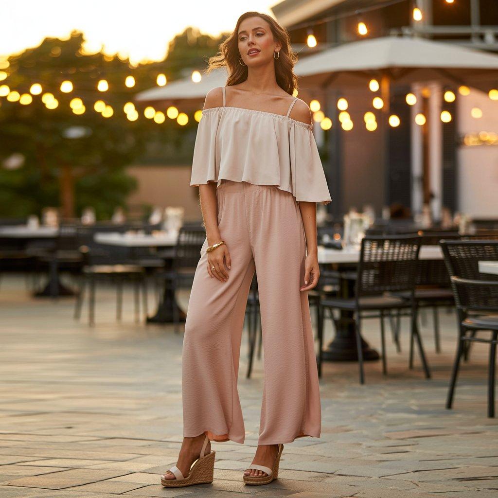 For those warm summer nights where you want something a bit dressier but still comfortable, an off-shoulder top with wide-leg pants and wedges works beautifully. The off-shoulder top feels breezy and fun, while wide-leg pants give flow and movement.