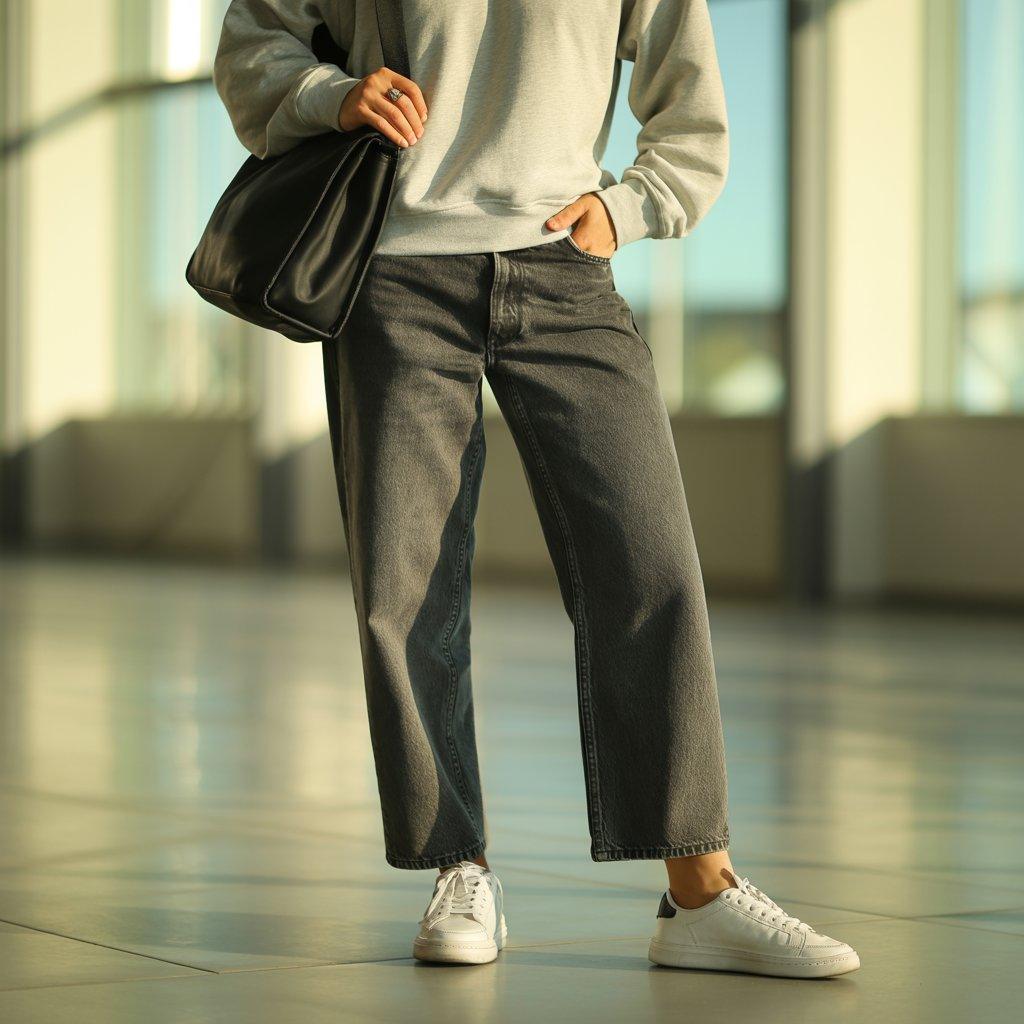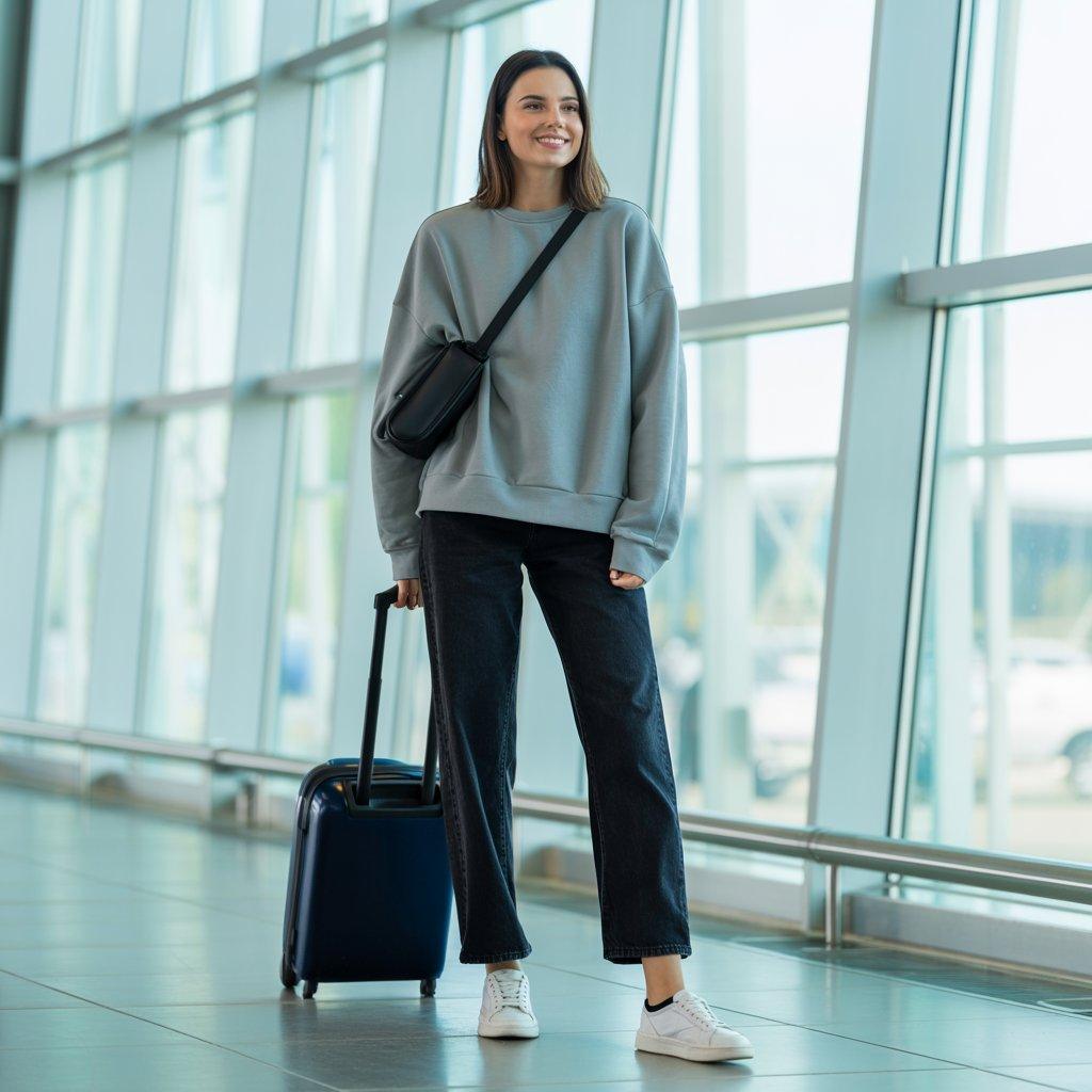 When you’re traveling, comfort matters, but that doesn’t mean you need to look sloppy. A relaxed sweatshirt paired with straight-leg jeans is one of the easiest outfits to rely on. The sweatshirt keeps you warm in air-conditioned spaces, while straight jeans give structure so the outfit still looks put together.