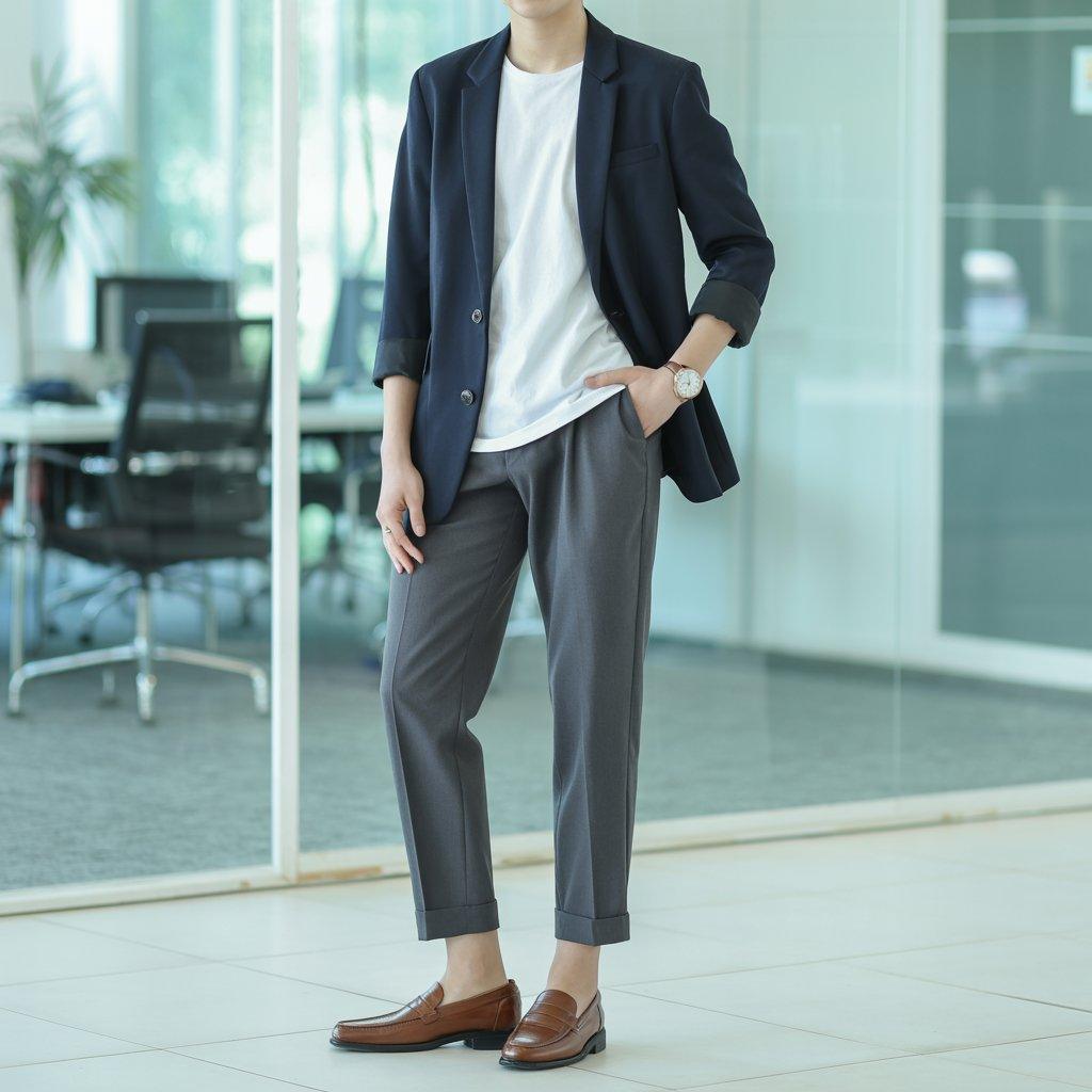 For a day when you have to show up looking a bit more professional like an internship or work event pair a lightweight blazer with a basic tee and trousers. A neutral blazer (like black, navy, or beige) instantly sharpens the whole outfit. A plain tee underneath keeps it from feeling too stuffy or formal.