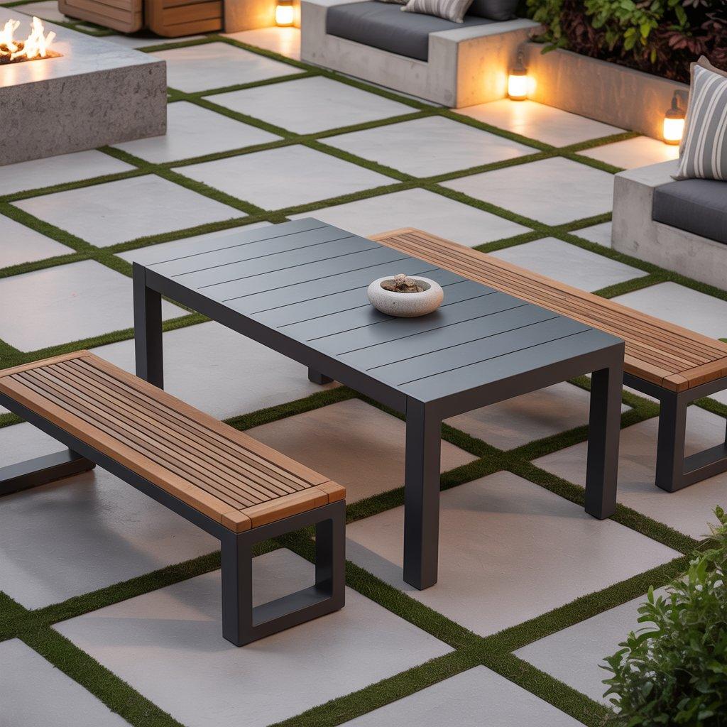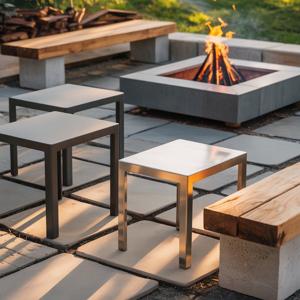 Metal tables, sealed wood placed away from the fire, concrete blocks, pavers, and exterior-rated finishes are all smart buys. They hold up better and usually need less upkeep.