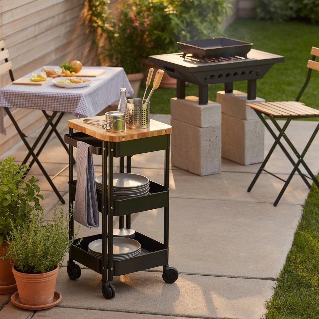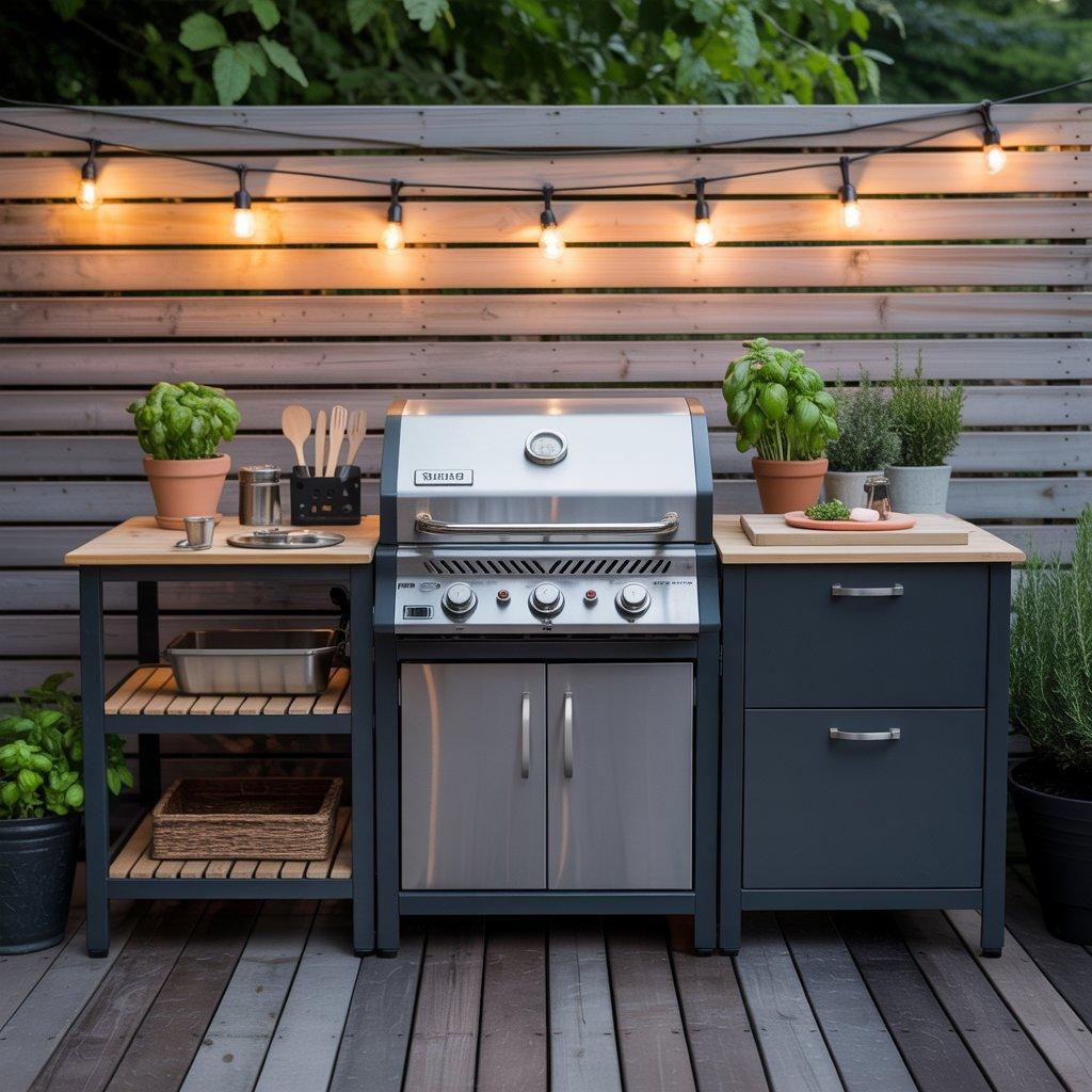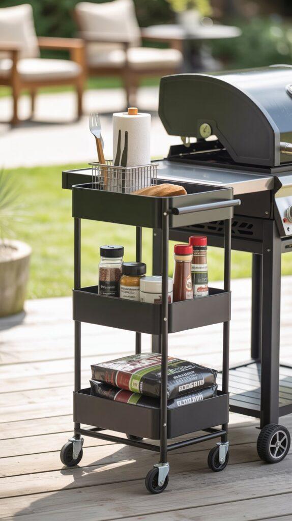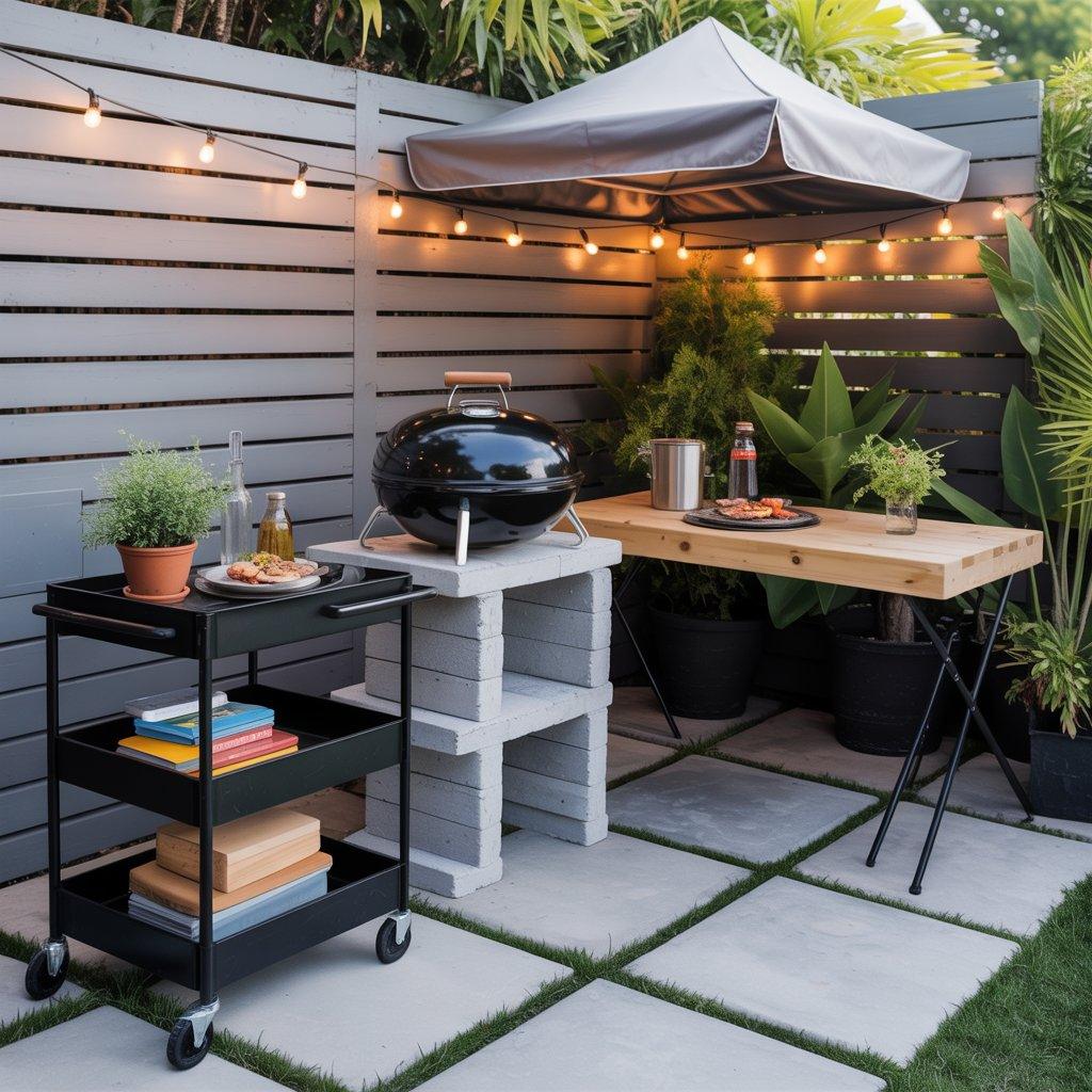 Use a rolling utility cart as an island. It’s cheap, mobile, and perfect for small patios. You get prep space and storage in one piece.