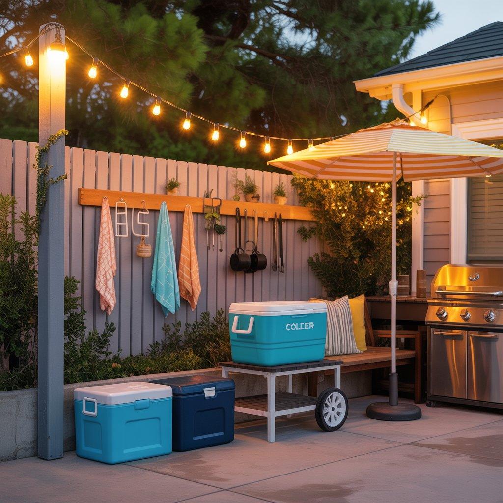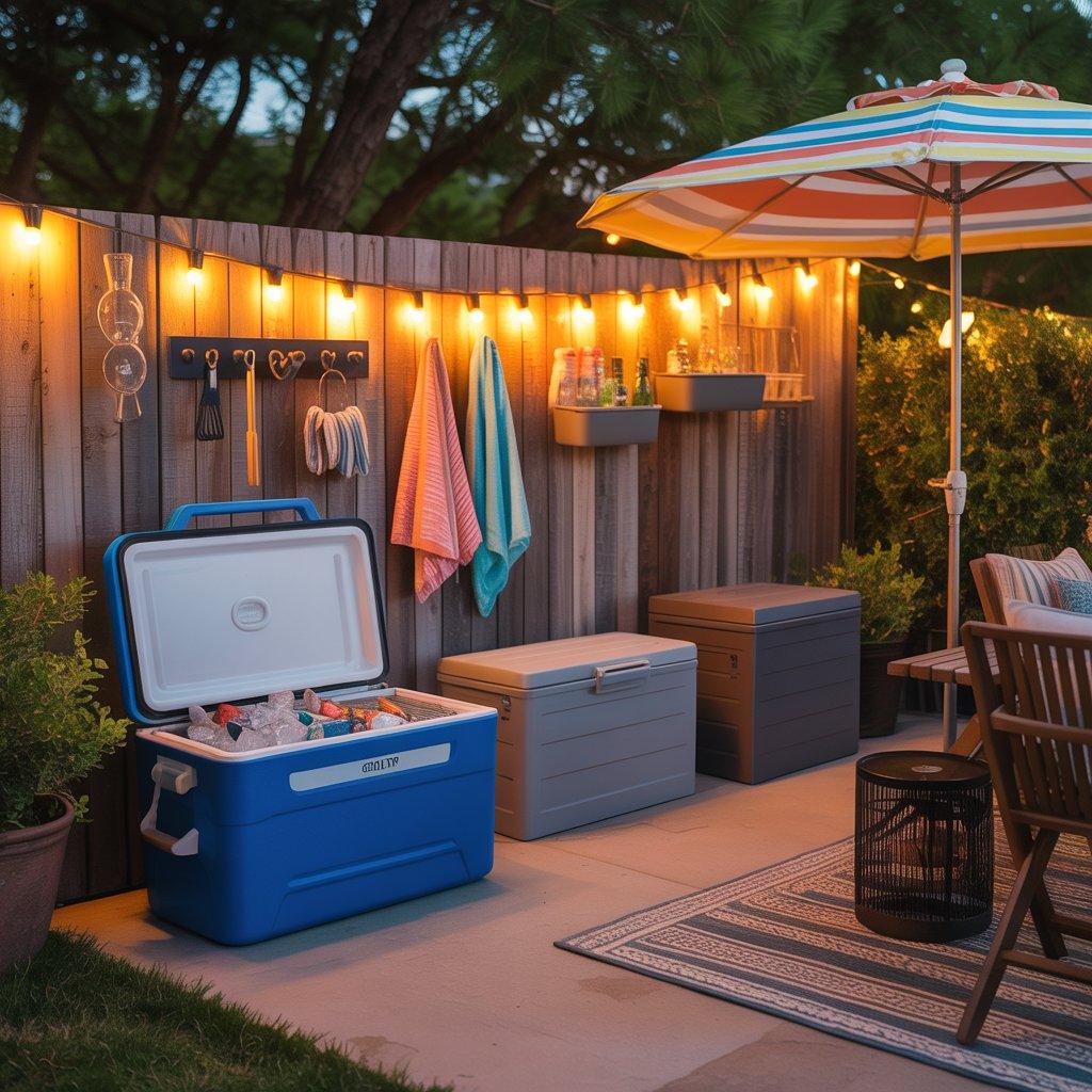 Use outdoor bins or deck boxes instead of custom storage. They keep supplies dry, and they cost much less than built-in cabinets.