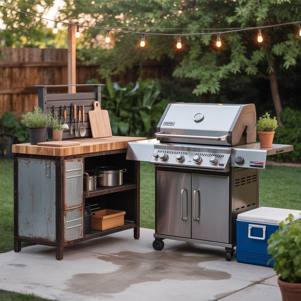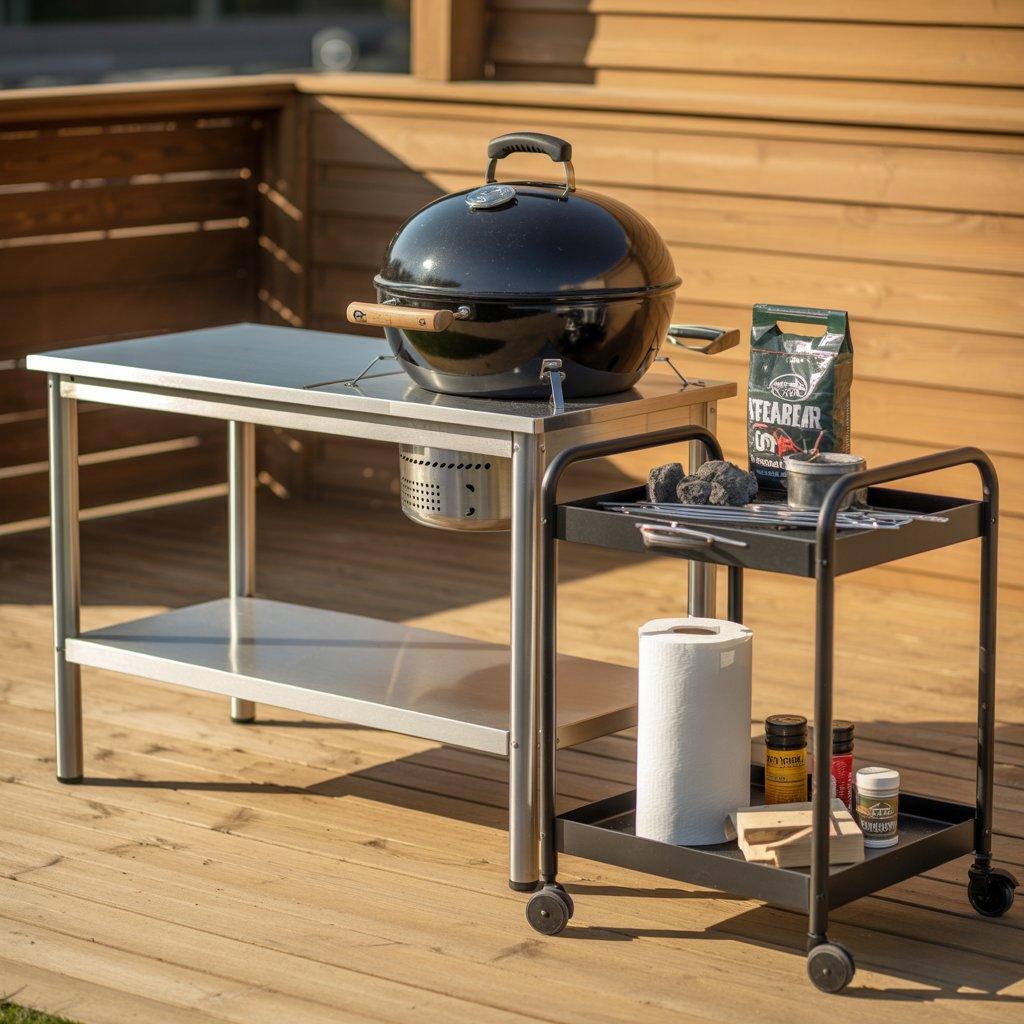 Next, add a metal worktable or a simple patio table for prep. After that, use one weather-resistant shelf, cart, or deck box for tools, charcoal, paper towels, and spices. That’s it. Like a three-legged stool, it stays useful because each part supports the others.