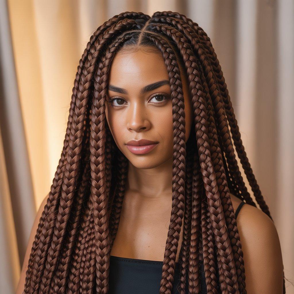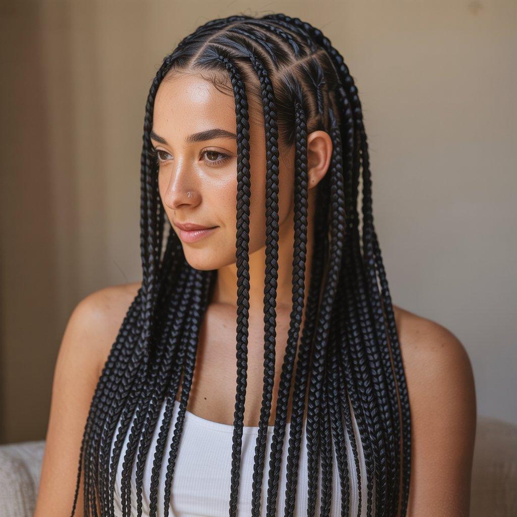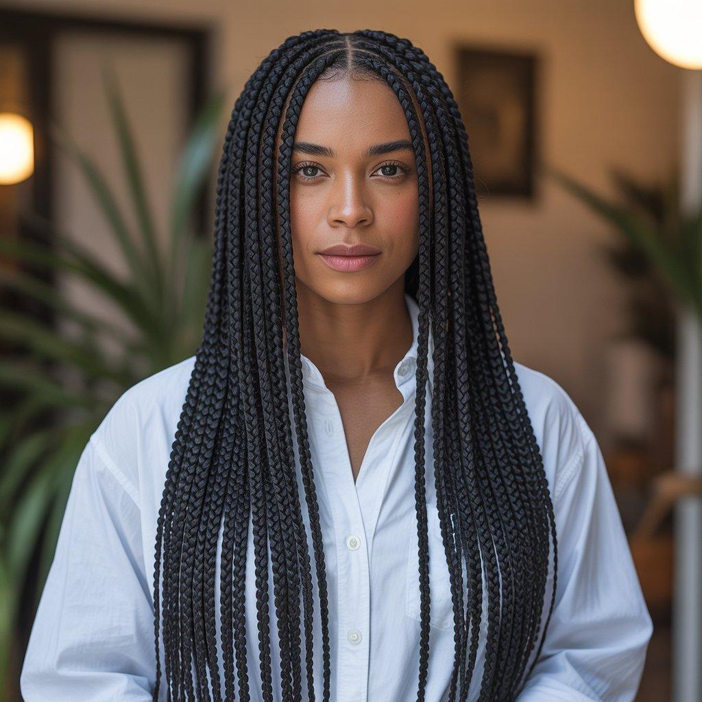 Ask your stylist to keep the braids lightweight. Long braid hairstyles should flow, not feel heavy. When done right, they look sleek and confident without trying too hard.