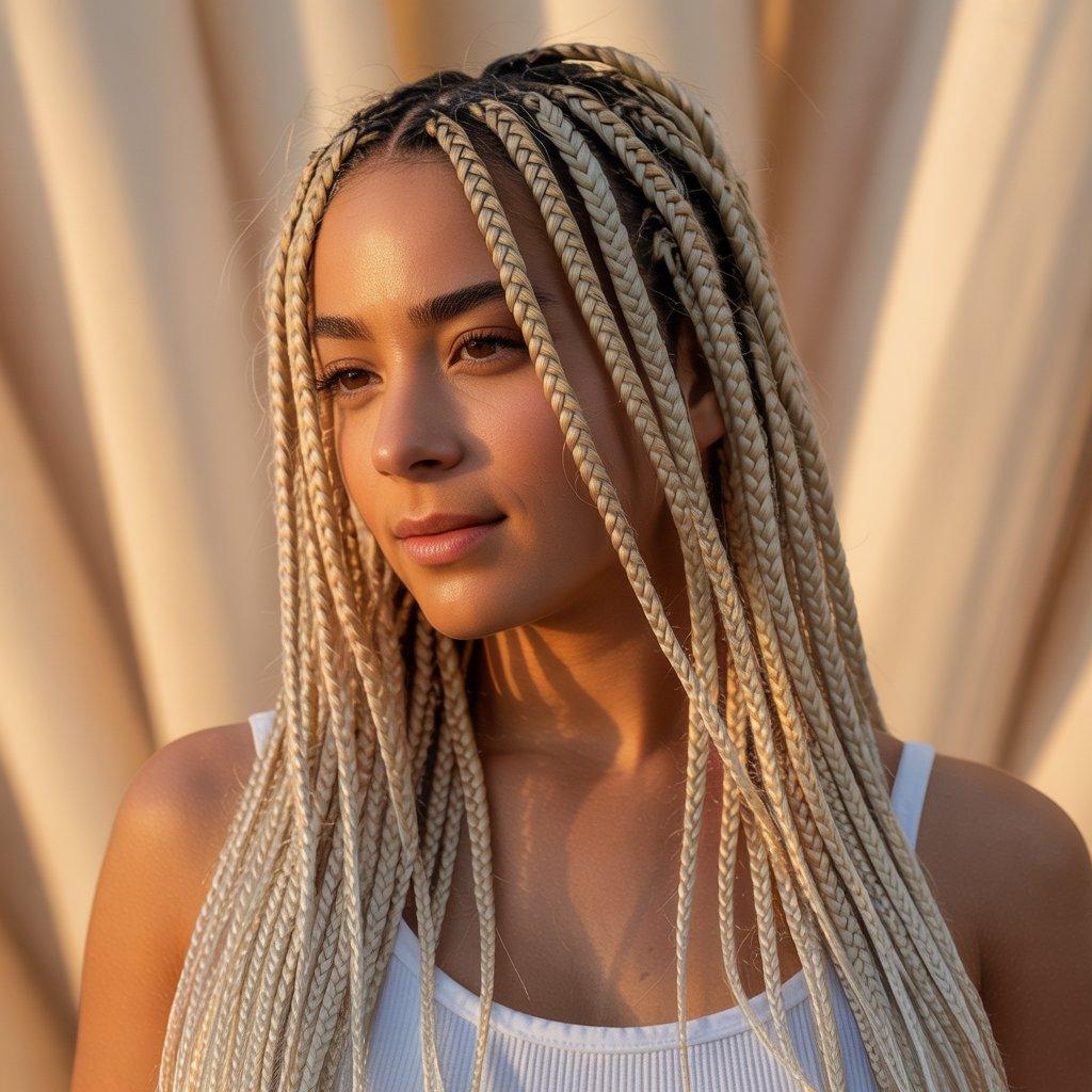 Blonde knotless braids have been trending strongly. Not bright yellow blonde, but soft honey, ash, or mixed tones. The color alone can completely change your look without cutting your hair.
