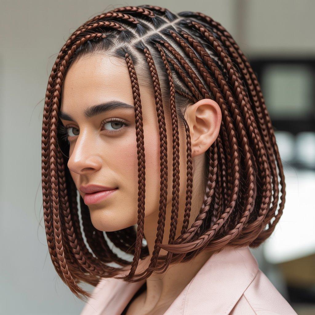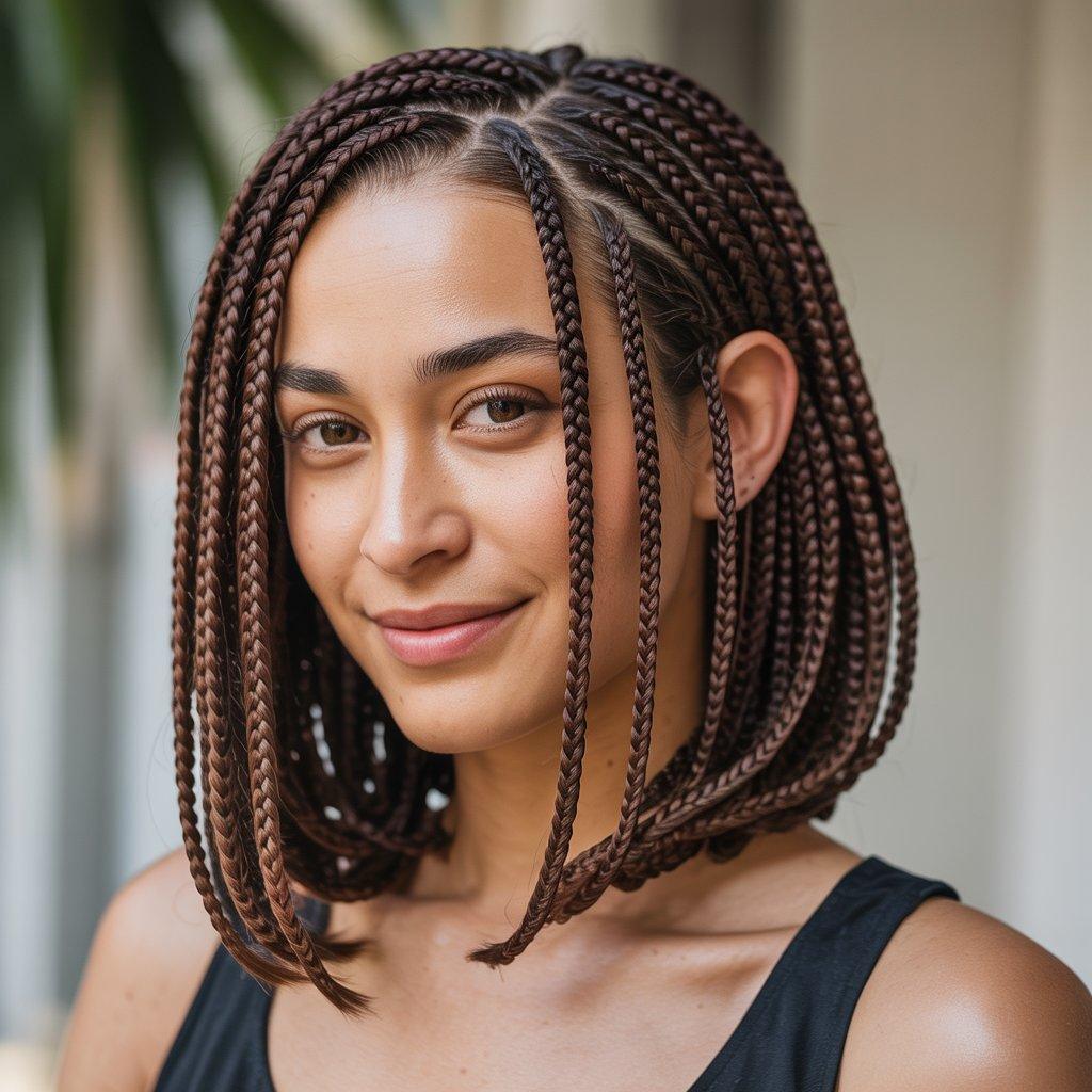 Not everyone wants long braids. Bob-length box braids are trending because they are light, neat, and easy to manage. They usually fall around the chin or shoulders, making them practical for everyday life.