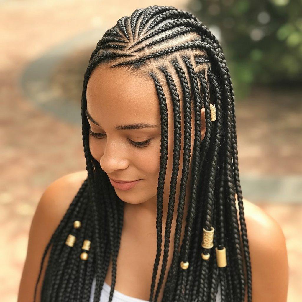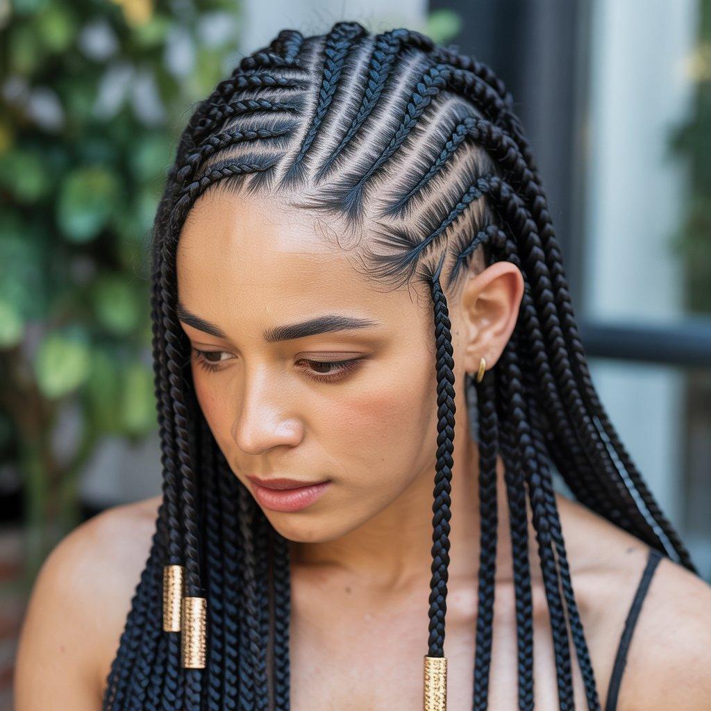 Fulani-inspired braids mix straight-back cornrows at the front with box or knotless braids at the back. Sometimes beads or cuffs are added, but not always. The front pattern is what makes it stand out.