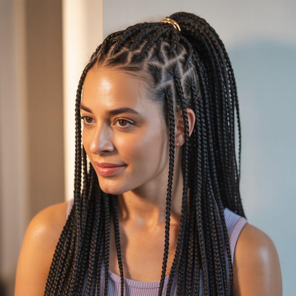 This works well for casual days or formal events. It also helps reduce tension because you’re not pulling all the braids into one tight ponytail. If you want a simple change without extra cost, this is an easy option.