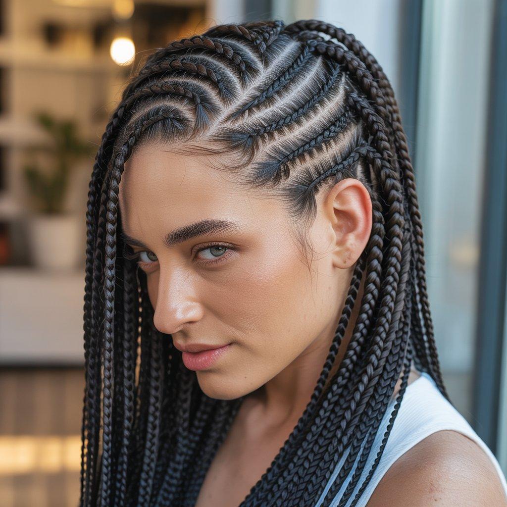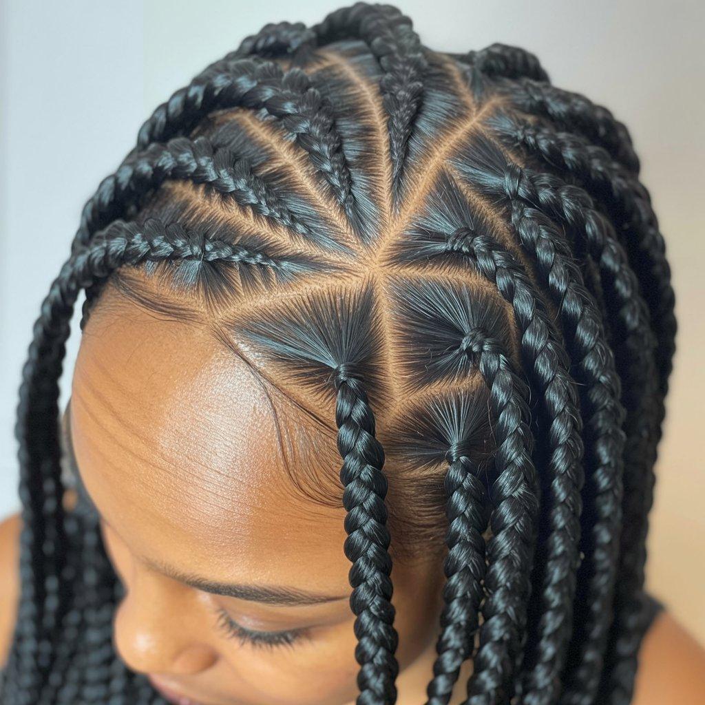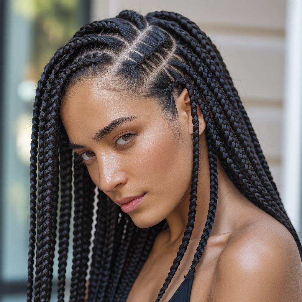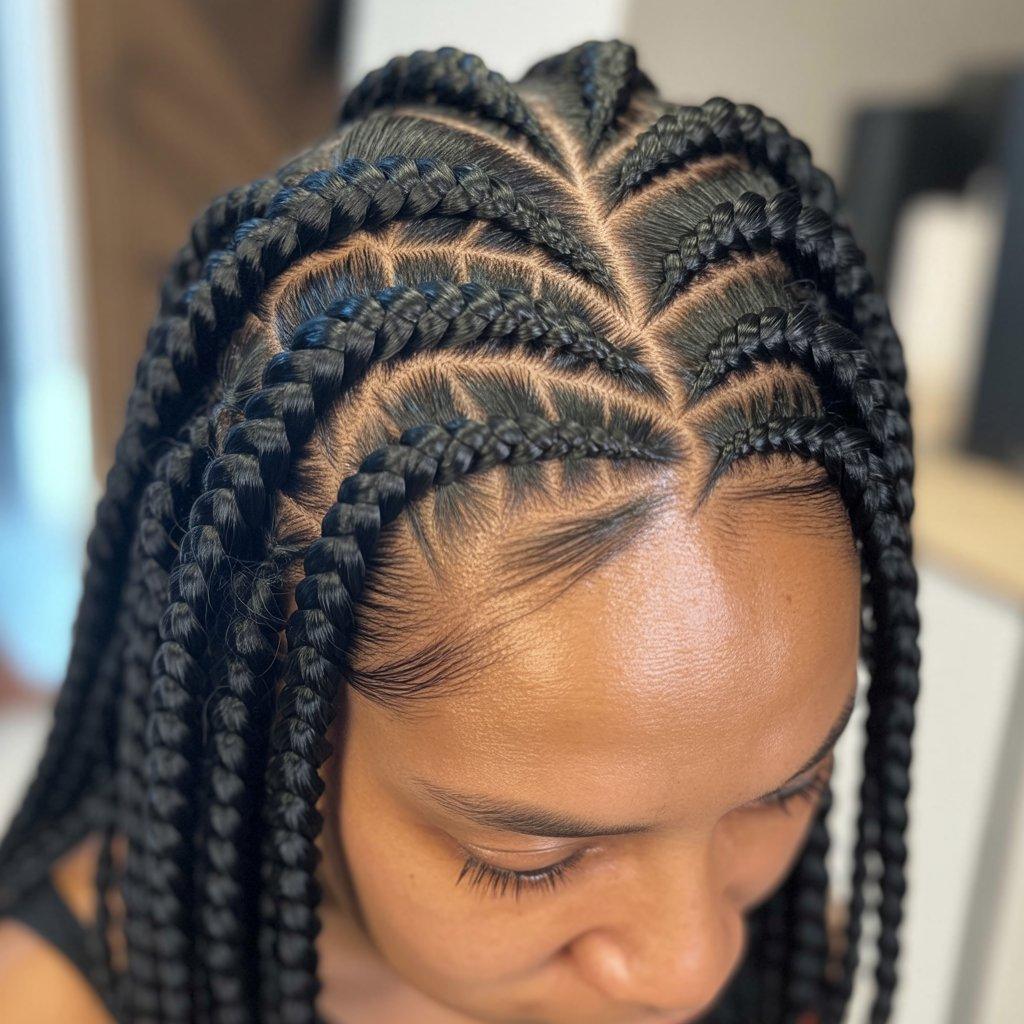 I’ve seen this style work well for people who want box braids but don’t want the standard layout. The angles give the scalp a more creative pattern, especially when the hair is styled up. It looks clean and intentional.