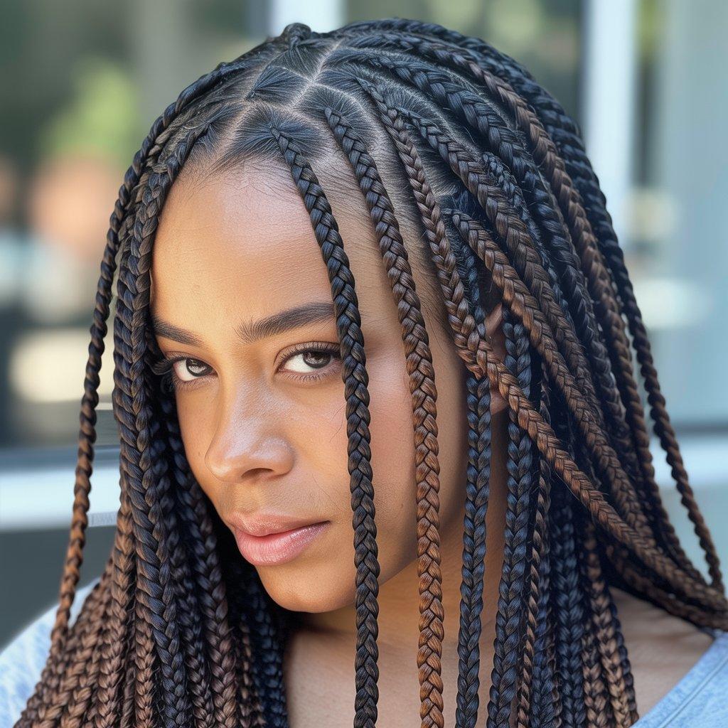 I like jumbo braids for people who prefer low-maintenance braid hairstyles. Fewer braids mean quicker styling in the morning. They also make a strong statement without needing extra accessories.