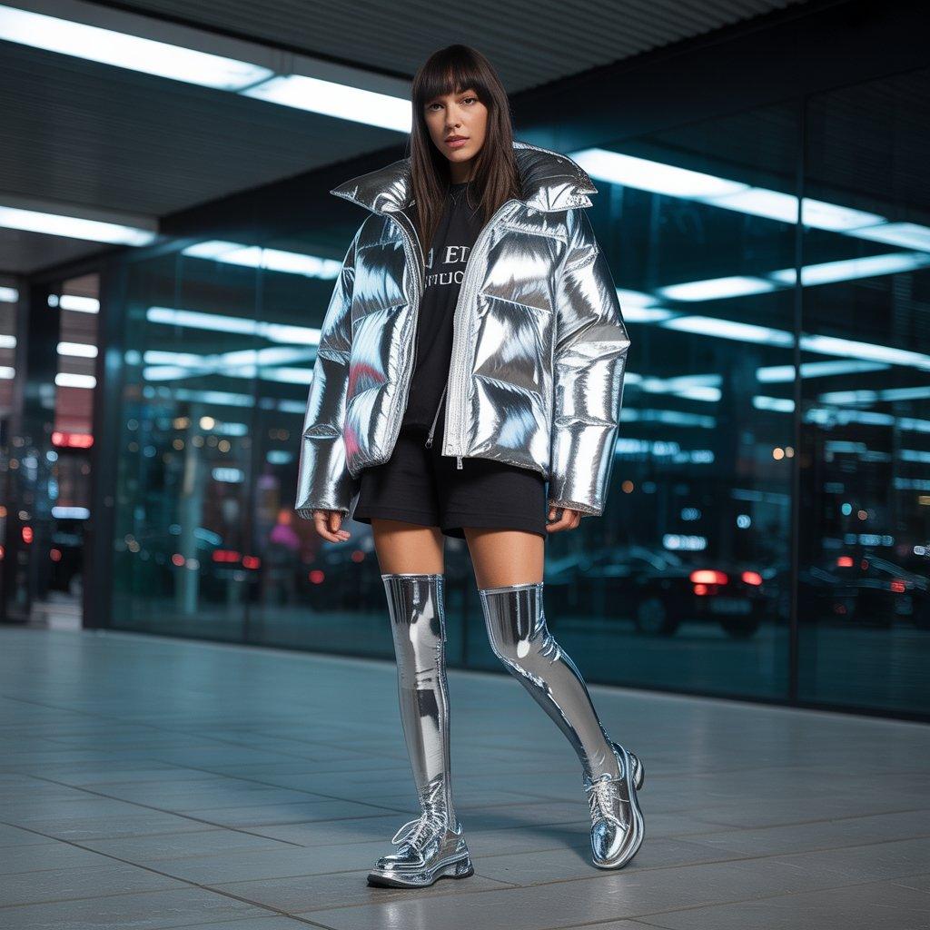 On the opposite end of the cozy spectrum, Gen Z is also leaning into shiny, space-age metallics. Think silver puffers, chrome accessories, and shoes that look like they belong in a sci-fi movie. This trend is a direct response to the earthy neutrals that dominated for so long it’s bold, attention-grabbing, and unapologetically fun.