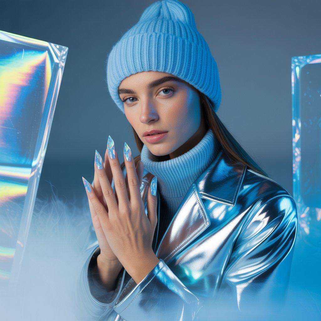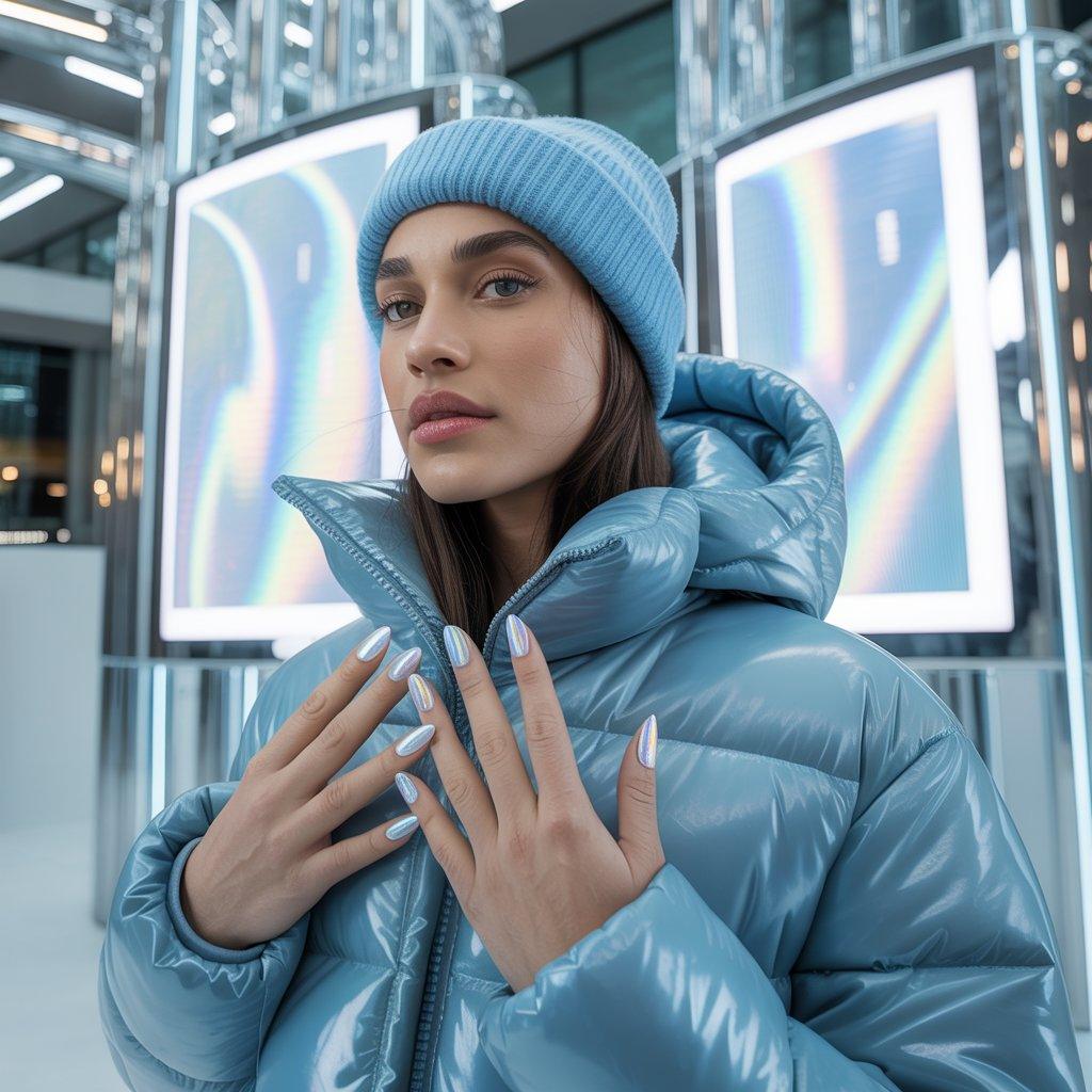 Think of a steel-blue jacket, a beanie in a glacier hue, or even opalescent nails that shimmer like ice. It is a subtle way to stand out without wearing neon. This trend fits perfectly with the “Extra Celestial” vibe that is also gaining traction futuristic shapes and holographic finishes that make you feel like you stepped out of a sci-fi movie.