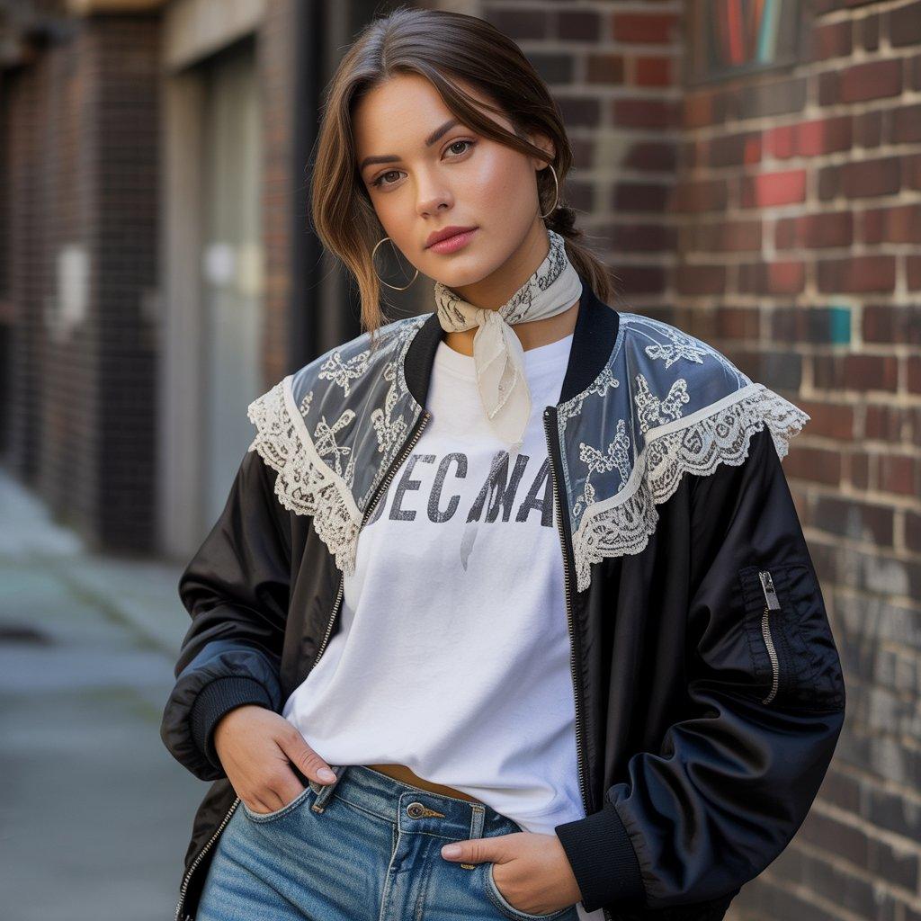 We’re talking bomber jackets with lace collars, crochet bandanas tied around the neck, or even a simple lace-trimmed top peeking out from under a graphic tee. It adds a soft, romantic texture to an otherwise casual outfit.